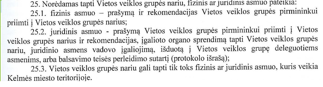 Kelmės miesto VVG nariu gali būti fiziniai ir juridiniai asmenys, registruoti Kelmės miesto vietos veiklos grupės teritorijoje, kaip tai apsprendžiama Kelmės miesto vietos veiklos grupės įstatuose: