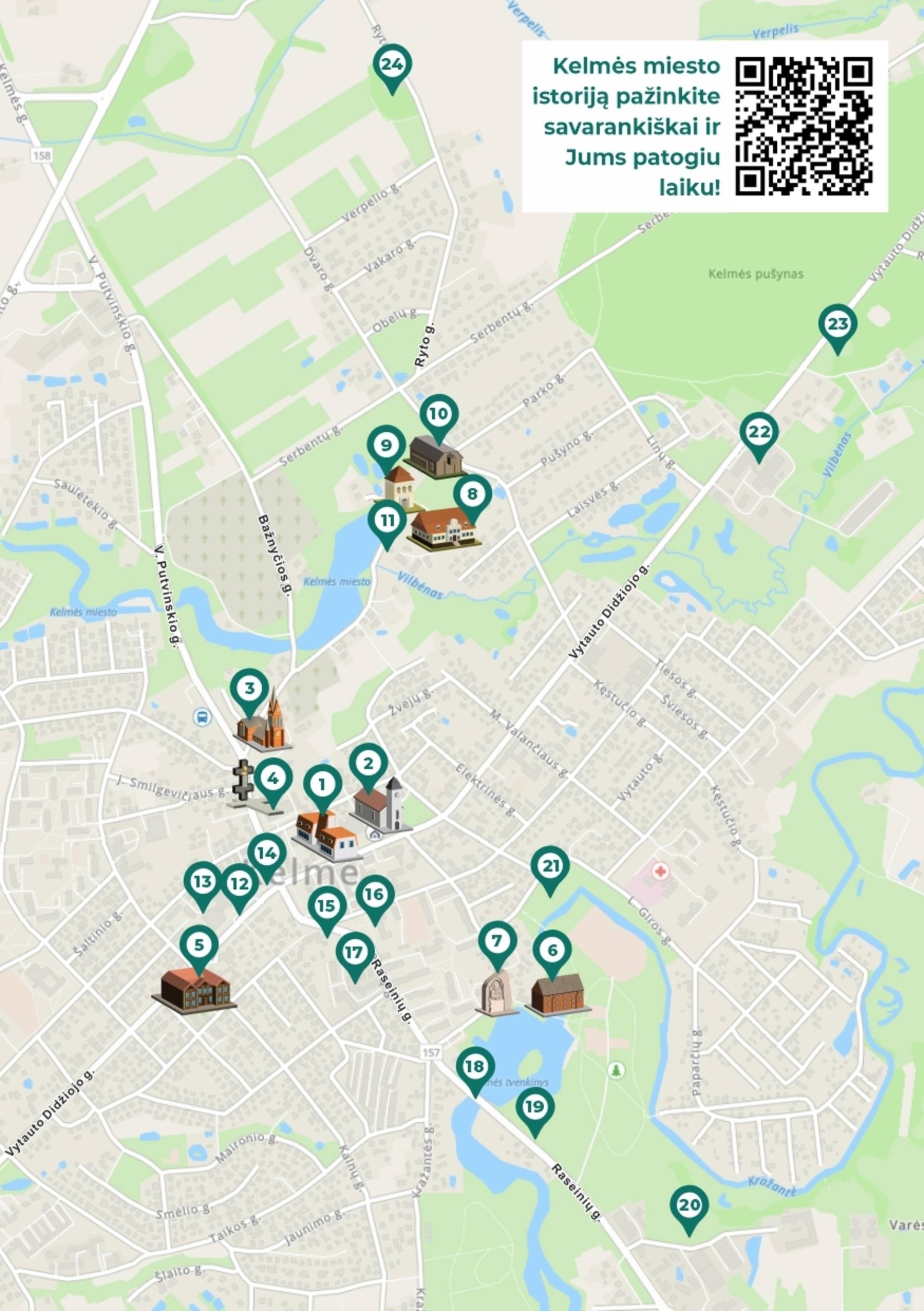Žemėlapį rasite Kelmės Žemaitės viešosios bibliotekos interneto svetainėje ir Kelmės miesto viešosiose erdvėse (QR kodai).