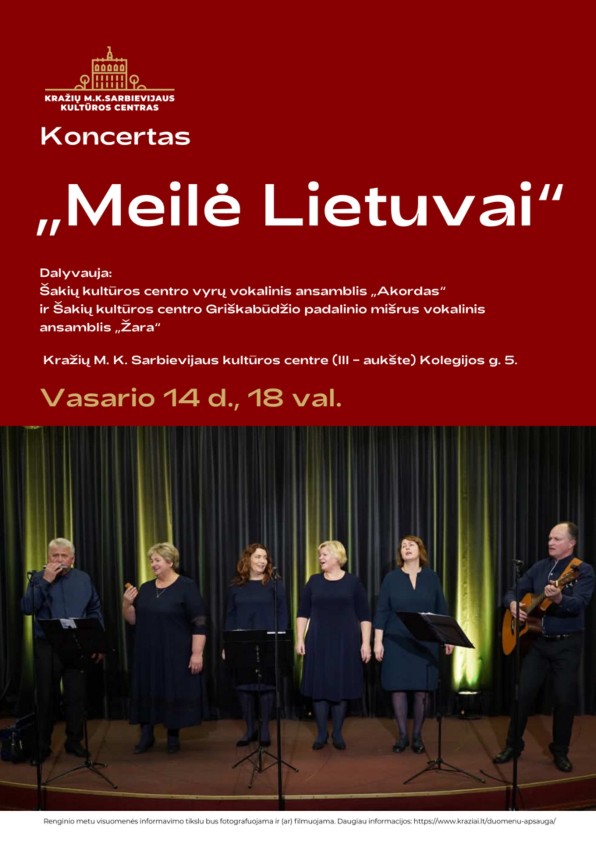 Vasario 14 d. 18:00 val. kviečiame į šventinį koncertą „Meilė Lietuvai“, kuris vyks Kražių M. K. Sarbievijaus kultūros centre. Renginyje skambės muzika, skirta Lietuvai ir širdžiai artimiems jausmams.